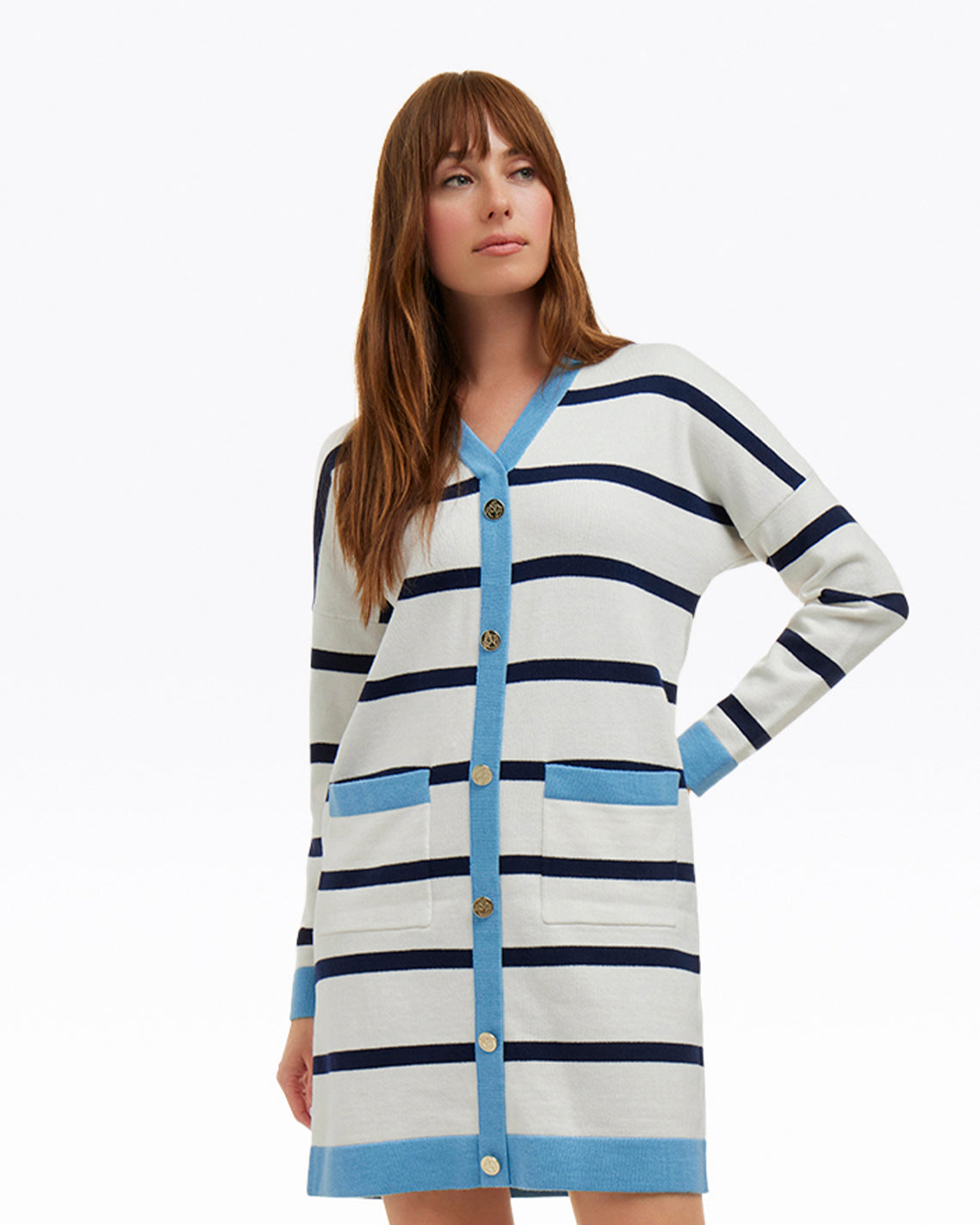 Show your stripes. Knit from a soft cotton-wool blend, Our Cassadee Cardigan Sweater Dress is as comfy as it is chic. Finished with a V-shaped neckline, contrast-colored edges and patch pockets, it has a classic look that’s perfect for work, weekend gatherings or whatever else you might have planned.