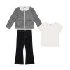 Laid-back with a little extra flair. This 3-piece outfit is made for cool days and even cooler style. The dusty pink peplum top features delicate smocking and puff sleeves, layered under a burgundy floral zip-up vest for added warmth and charm. Dark wash flared jeans give the look a retro finish that’s comfy and on trend. Just add sneakers or booties to take her from school to weekend plans with ease.