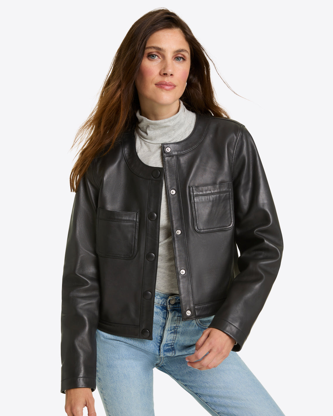 Lady like. Our Leather Collarless Jacket boasts a classic shape, albeit in a very cool material, so you can wear it pretty much anywhere. It’s a no-brainer with jeans and a T-shirt, but we love it over dresses, too, with a pair of boots.