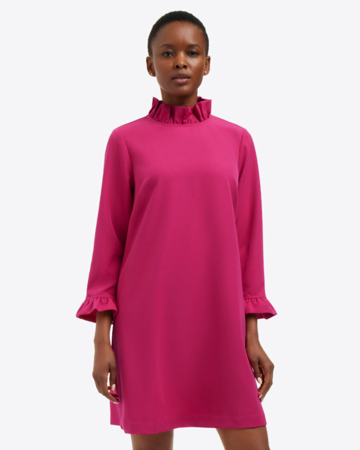 Give ’em short shift. Our Lindsay Shift Mini Dress is cut from a heavy crepe with the perfect amount of stretch and finished with a ruffled mock turtleneck and cuffs. Wear it with clogs and a pair of dangly earrings to work, dinners out or whatever else you have planned.Â