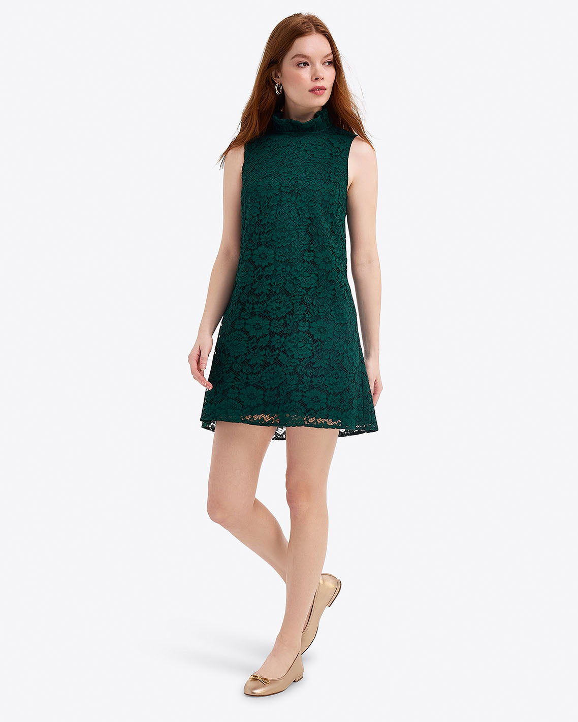 Give ’em short shift. Our Lindsay Sleeveless Shift Mini Dress in Lace is a classic silhouette cut from floral lace and finished with a ruffled mock neck. Wear it with heels and a pair of dangly earrings to holiday parties, dinners out or whatever else you have planned.Â