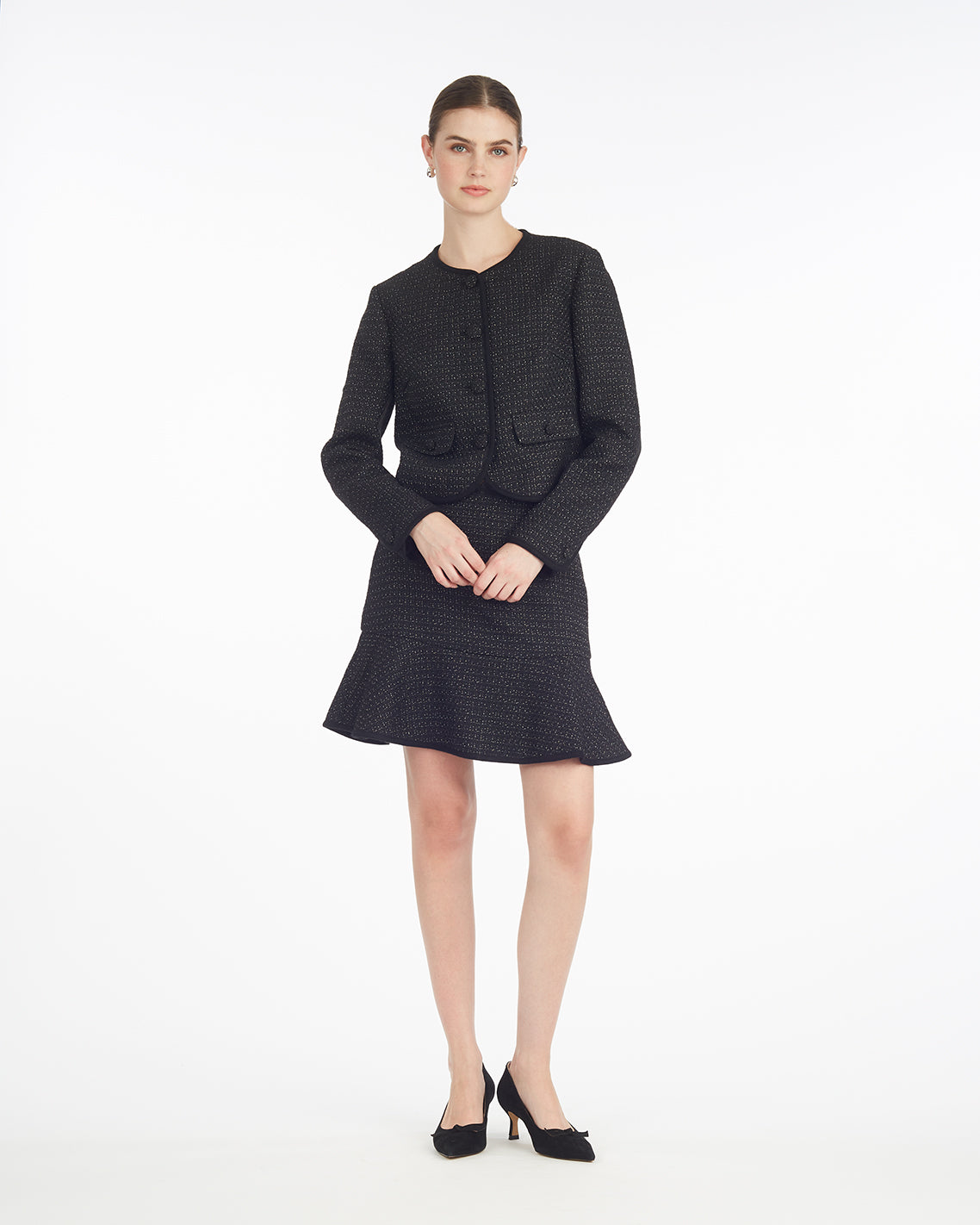 Classic with a modern twist, the Mini Flounce Skirt is made to move with you. Featuring clean paneling and crisp pleats, it’s structured with just the right amount of softness. Dress it up or down—it’s a versatile staple that brings texture and polish to any look. Pair with our matching jacket or a tucked-in blouse and ballet flats for a timeless silhouette, or layer with a sweater and boots for cooler days.