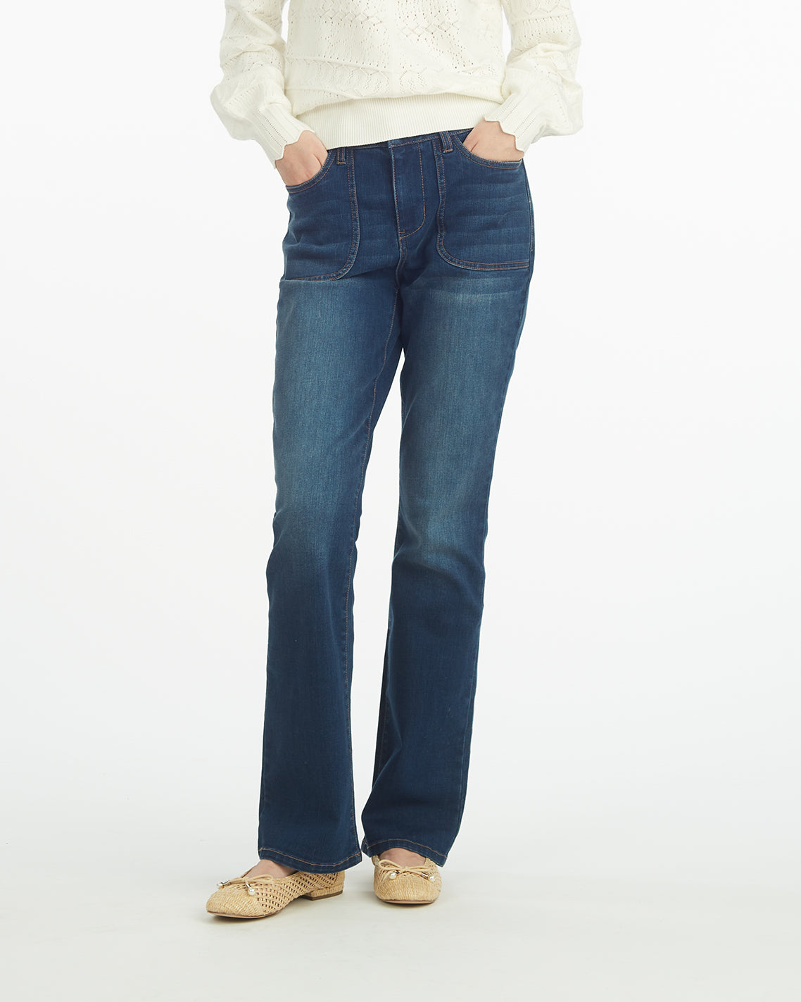 Meet your new everyday denim—classic, versatile, and just the right amount of stretch. Crafted from a soft cotton blend with recycled Repreve® fibers and a hint of elastane, these jeans move with you while holding their shape. The wide leg bootcut silhouette creates an elongating fit, while patch front and back pockets add both style and function.