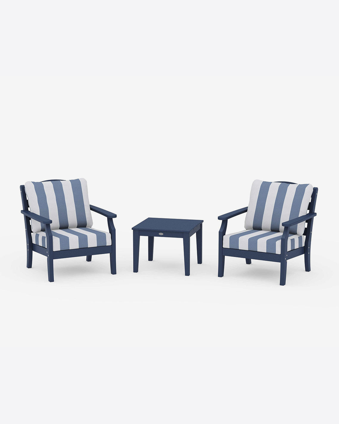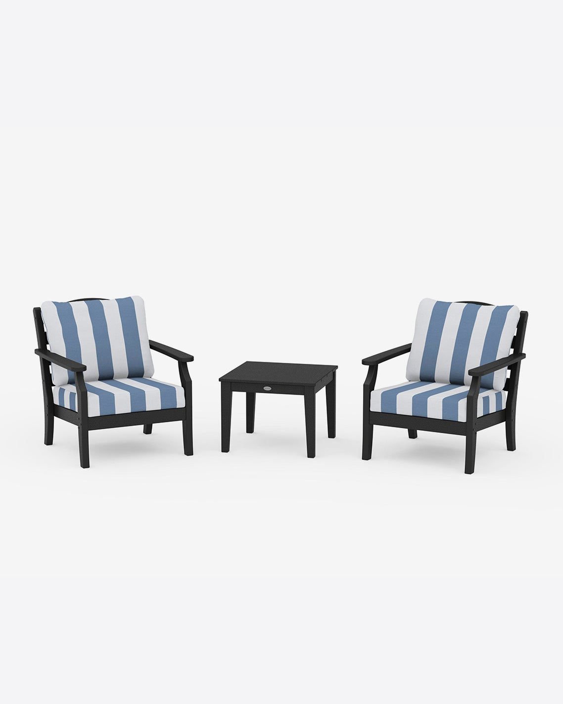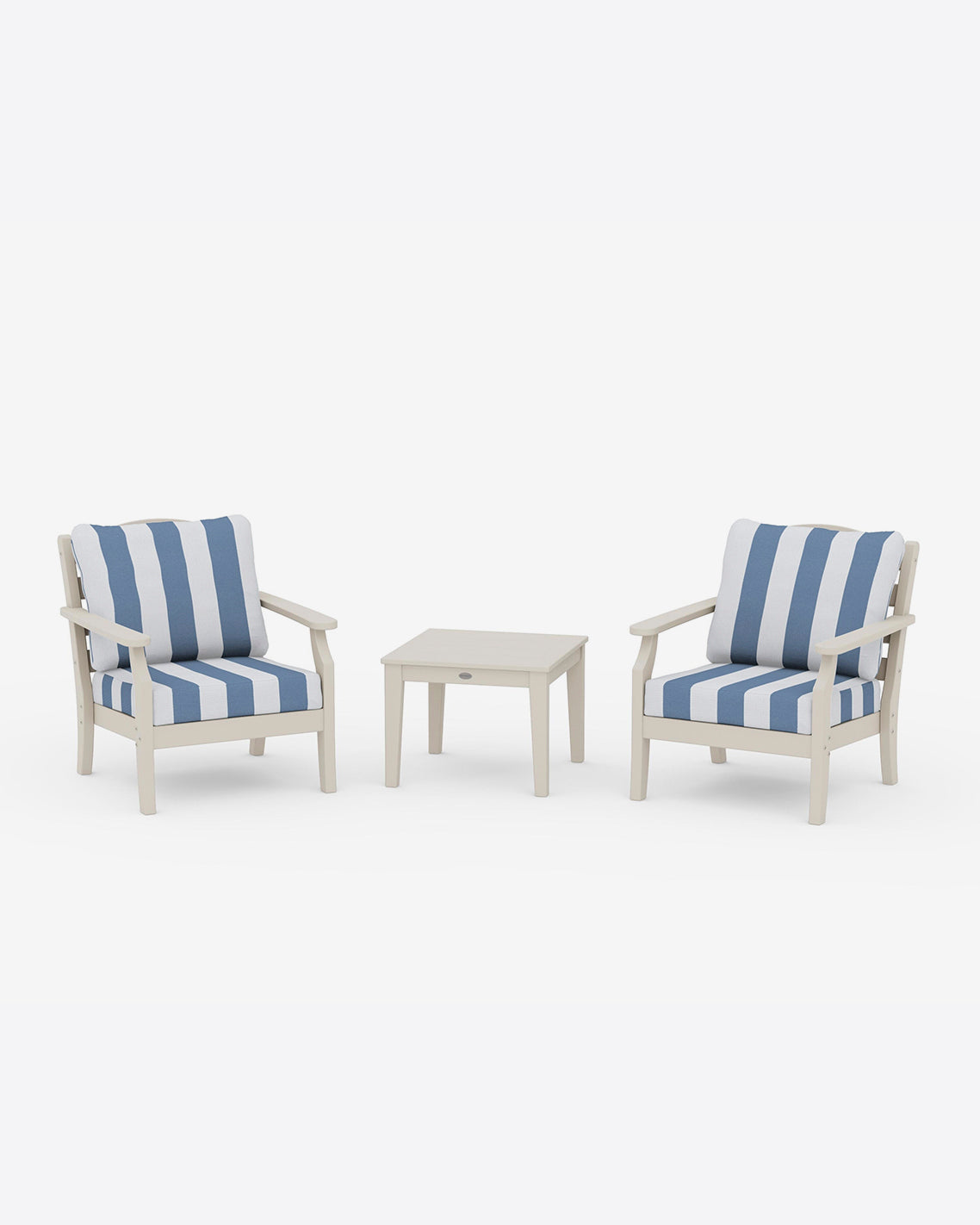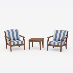 Heritage design. Modern all-weather durability. Sweet scalloped details. This exclusive collection is our love letter to Southern charm and hospitality. With a place to put drinks and sink-in cushions for all-day comfort, the Draper James by POLYWOOD Savannah 3-Piece Deep Seating Set invites folks outside for warm gatherings and well-deserved downtime.