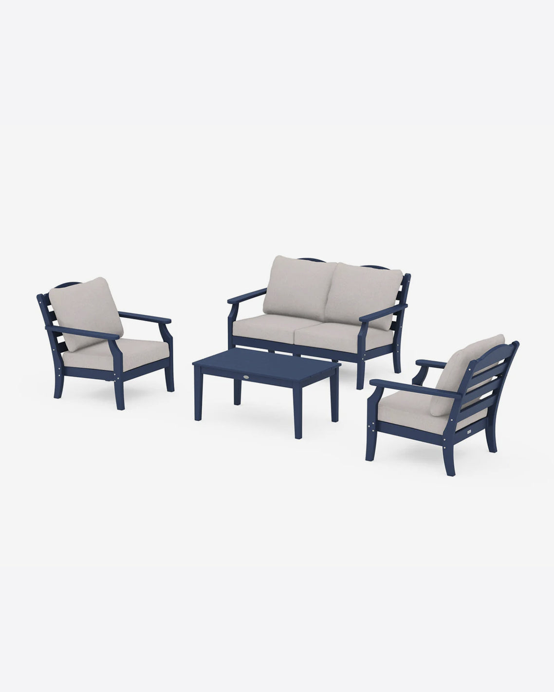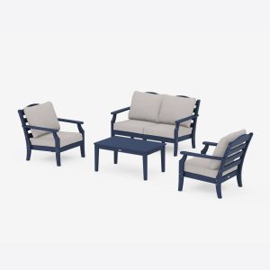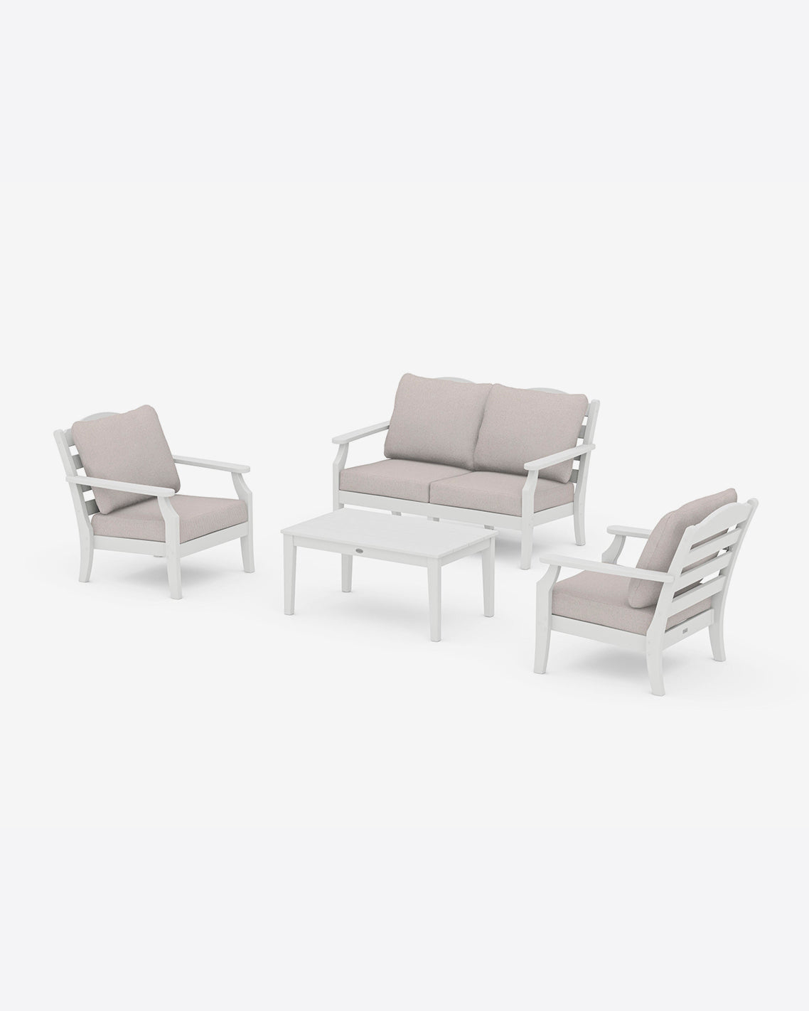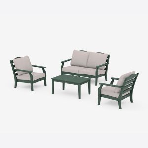 Heritage design. Modern all-weather durability. Sweet scalloped details. This exclusive collection is our love letter to Southern charm and hospitality. With a place to put drinks and sink-in cushions for all-day comfort, the Draper James by POLYWOOD Savannah 4-Piece Deep Seating Set with Loveseat invites folks outside for warm gatherings and well-deserved downtime.